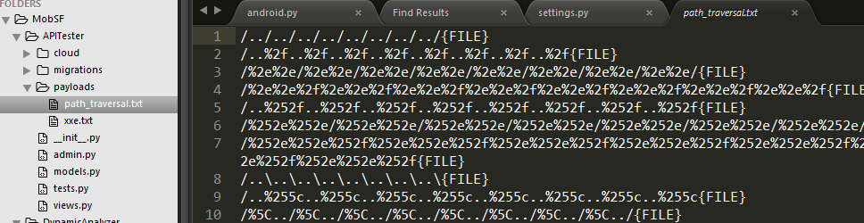MobSF框架中API Fuzzer模块主要对 Web API 的安全性进行检测,如收集信息,分析安全头部信息,识别API 的具体漏洞,目前支持SSRF、XXE、Path Traversal等漏洞的扫描,XXE及Path Traversal测试Payloads在APITester\payloads\路径下: