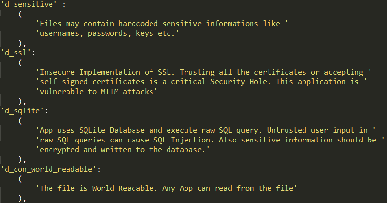 通过在setting文件中预定义设置的特征来匹配检测结果,同时MobSF也支持与云端的连接,从而进一步准确和全面的检测安全漏洞。