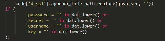 源代码分析部分主要利用正则表达式对java源码进行匹配来实现的。主要通过匹配常见方法中的关键词来提取源码中用到的方法。 通过匹配敏感关键词来提取账号密码等信息: