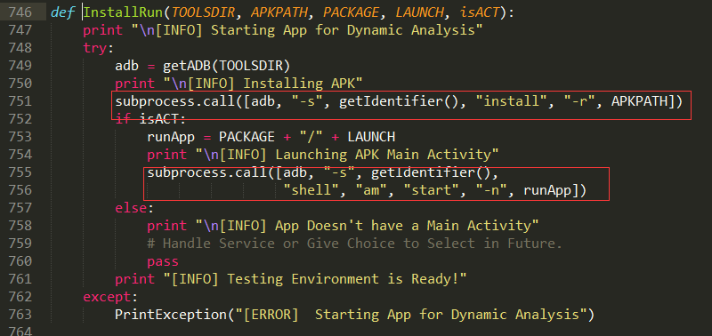 该功能主要由GetEnv函数实现Web代理设置,adb命令接口实现app的安装、运行。MobSF与虚拟运行环境连接后,即开始动态分析流程。