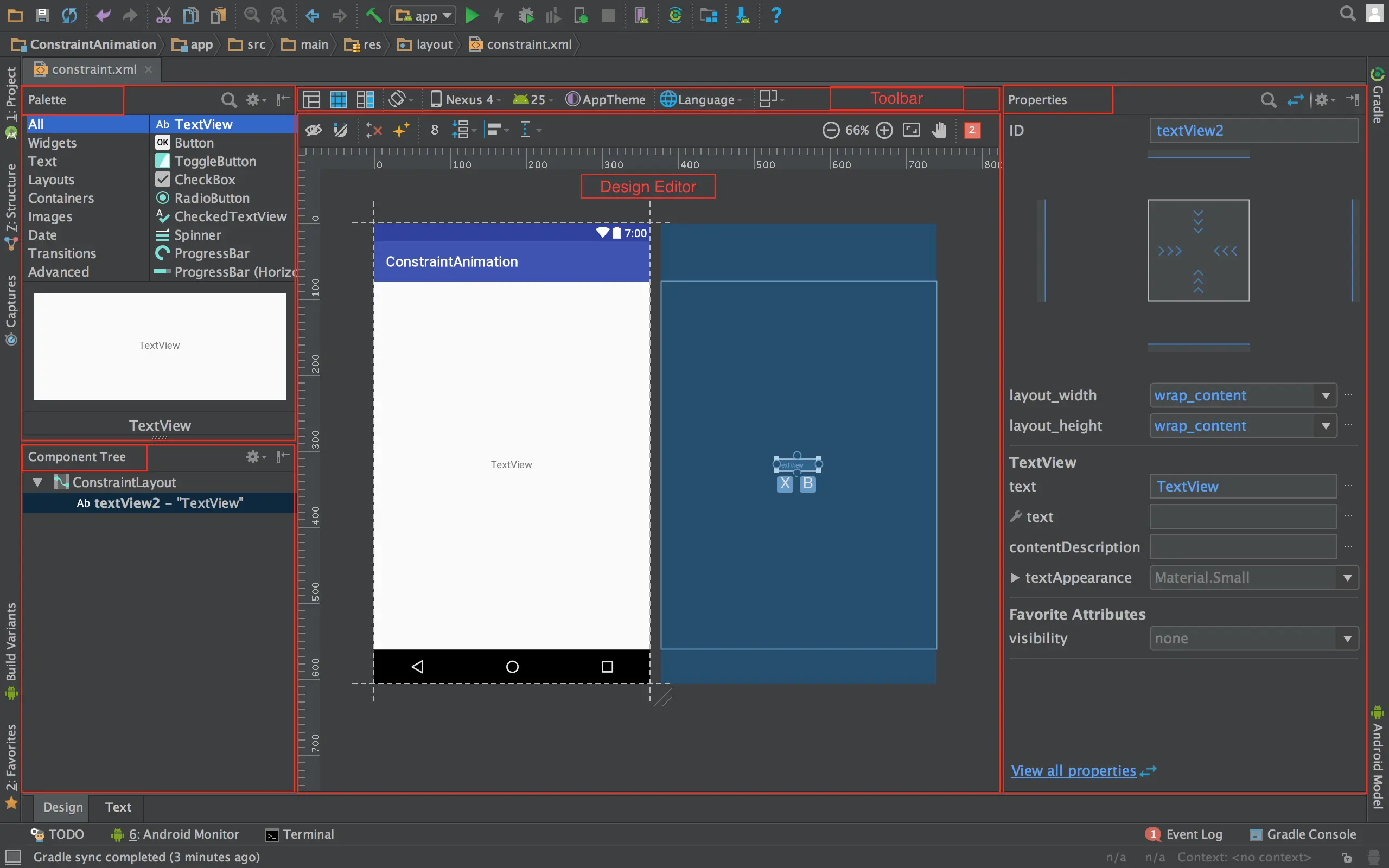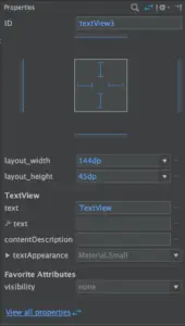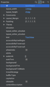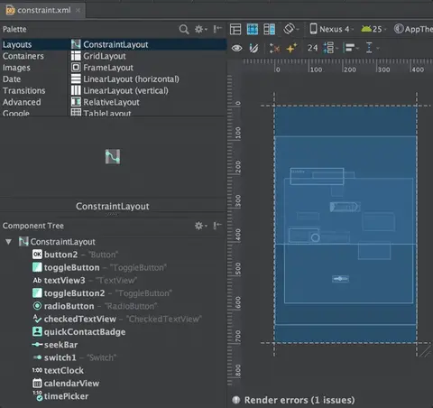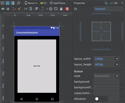 从 Palette 窗口选取 UI 组件 -> 拖拽到 Design 编辑器中 -> 在 Property 窗口中改变组件的属性(宽度,高度,文字,外边距,内边距… 等等) -> 在 Design 编辑器中调整约束关系。