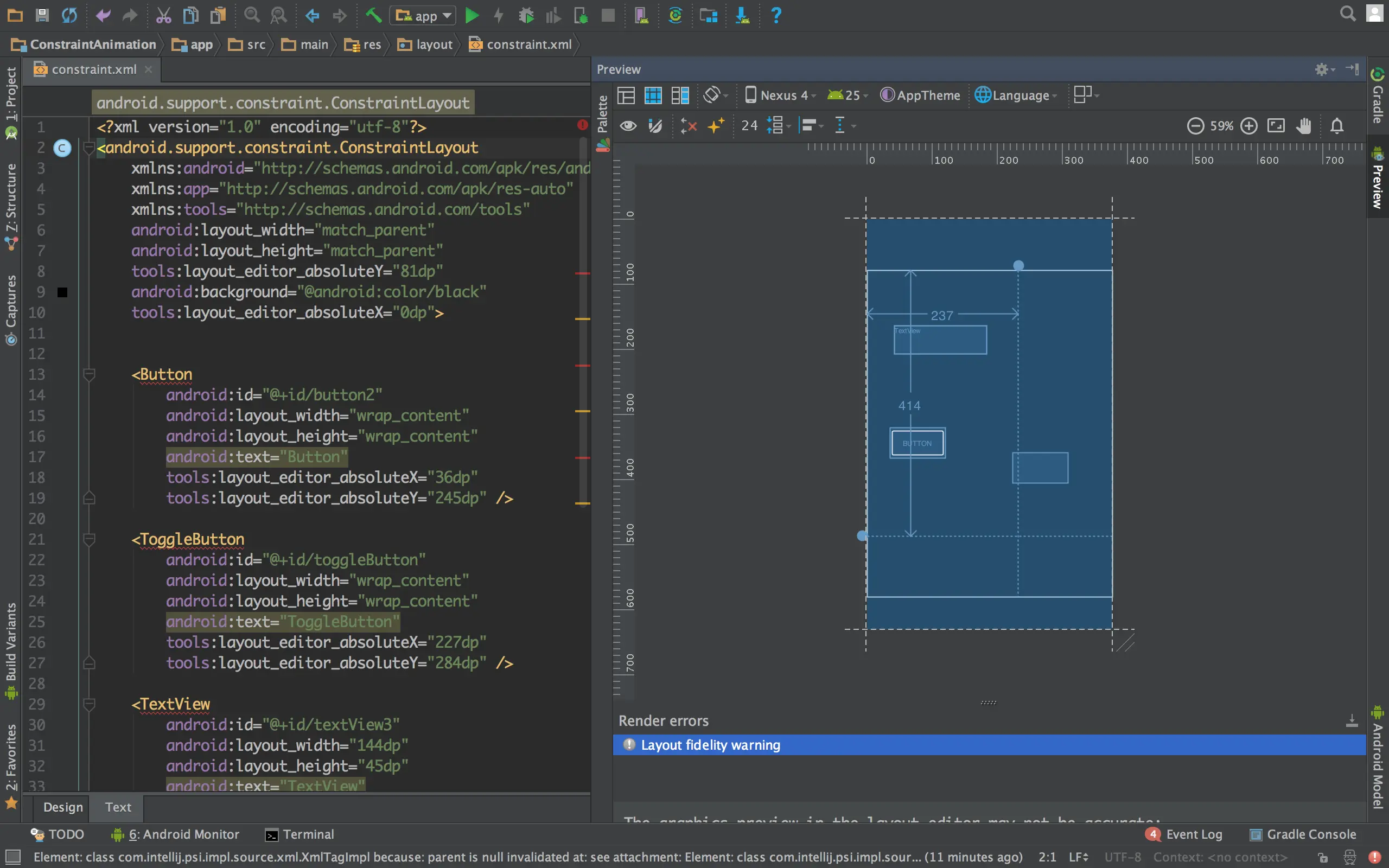 这里我将一个原本属性为 match_parent,match_parent 的按钮修改为了 wrap_content,wrap_content。
