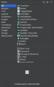 在这里你可以获取到 Android 提供的所有 UI 组件。在右上角有一个搜索图标,你可以通过搜索节省寻找的时间。搜索图标的右边还有一个设置图标。点击这个酷炫的图标,你可以根据个人喜好更改 UI 组件的外观。