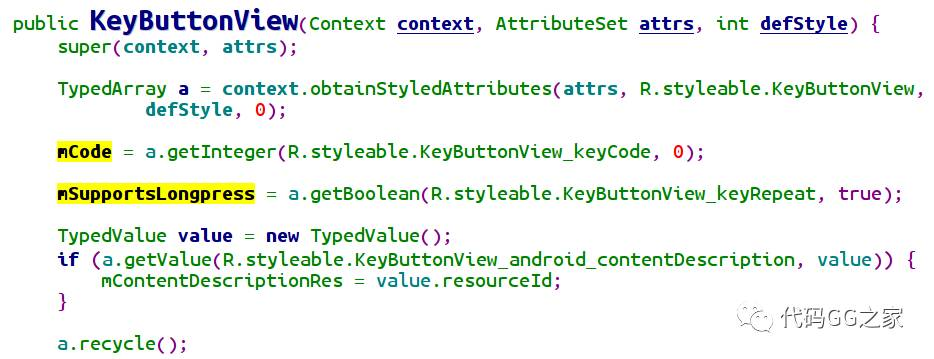 此处为:继承自ImageView(于是我们知道它是类似ImageView的啦,那么我们基本可以从ImageView猜出KeyButtonView至少能做什么,至少ImageView一般都是要显示图的啦)基础的长按,短按消息都是可以支持的了。