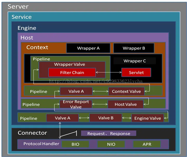 Container:可以理解为处理某类型请求的容器,处理的方式一般为把处理请求的处理器包装为Valve对象,并按一定顺序放入类型为Pipeline的管道里。Container有多种子类型:Engine、Host、Context和Wrapper,这几种子类型Container依次包含,处理不同粒度的请求。另外Container里包含一些基础服务,如Loader、Manager和Realm。