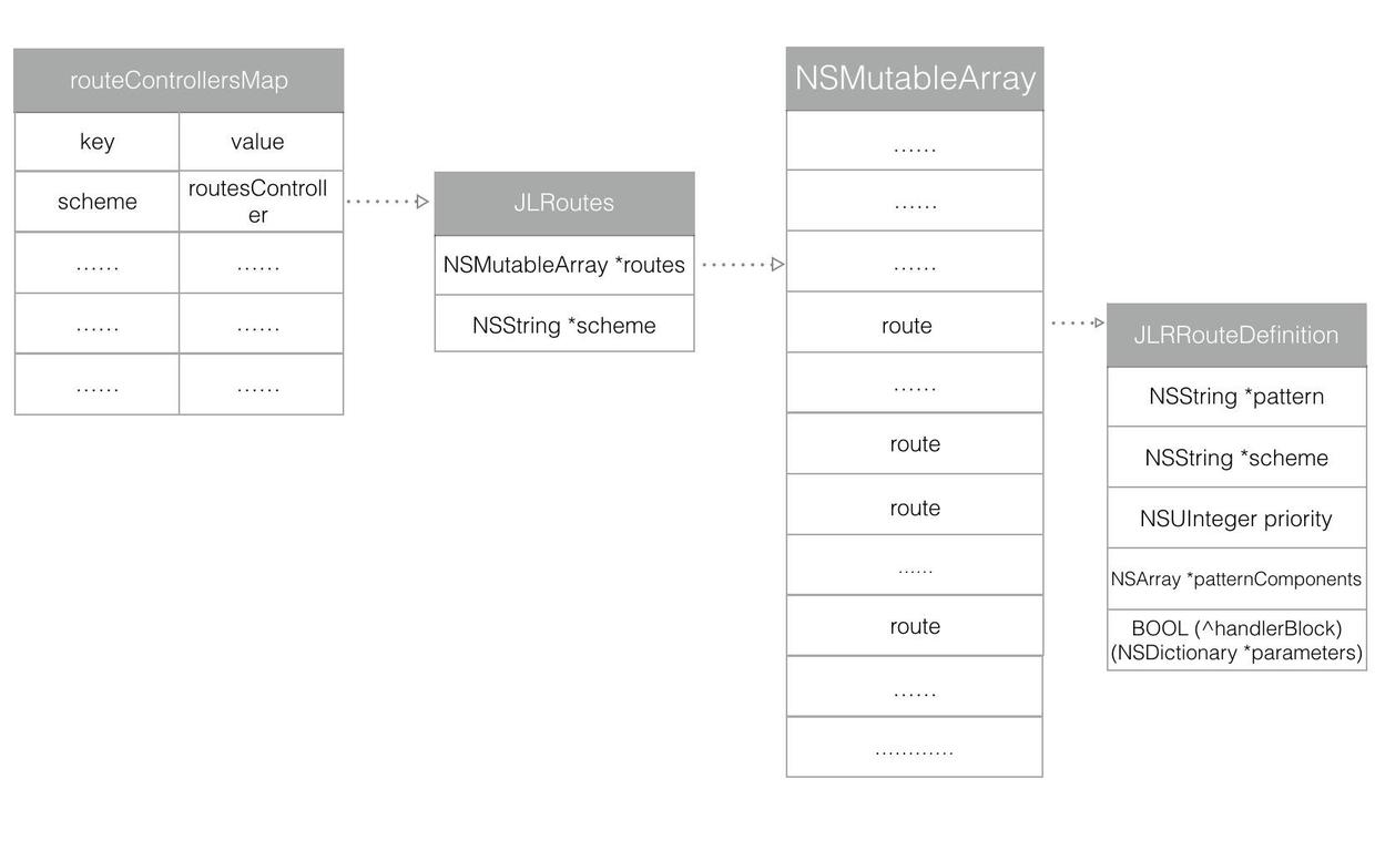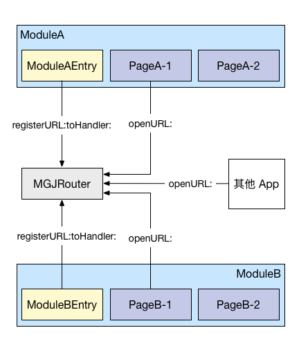 首先URLRoute也许是借鉴前端Router和系统App内跳转的方式想出来的方法。它通过URL来请求资源。不管是H5,RN,Weex,iOS界面或者组件请求资源的方式就都统一了。URL里面也会带上参数,这样调用什么界面或者组件都可以。所以这种方式是最容易,也是最先可以想到的。