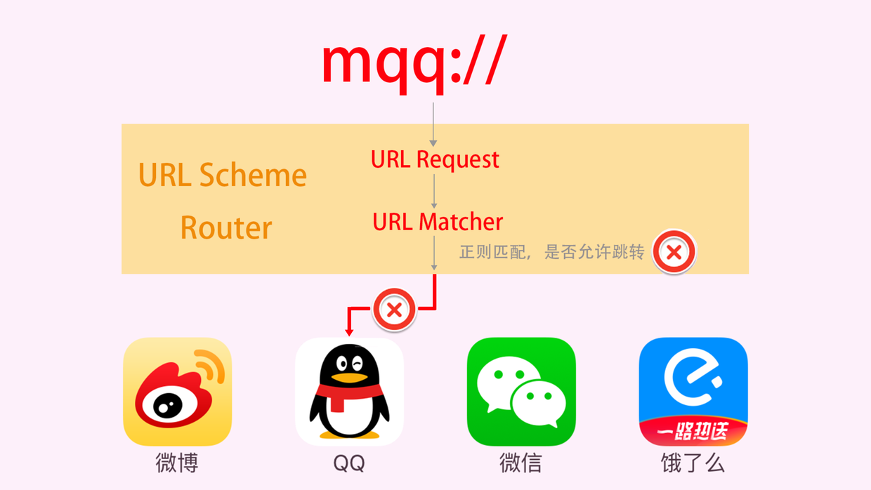 如上图,饿了么App允许通过URL Scheme调用,那么我们可以在Safari里面调用到饿了么App。手机QQ不允许调用,我们在Safari里面也就没法跳转过去。
