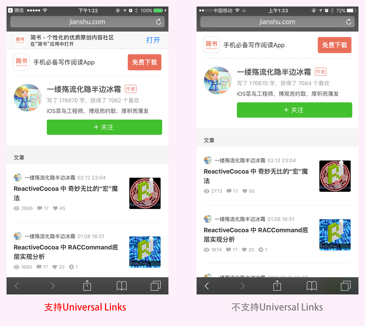 在浏览器里面也是一样的效果,如果是支持了Universal Links方式,访问相应的URL,会有不同的效果。如下图: