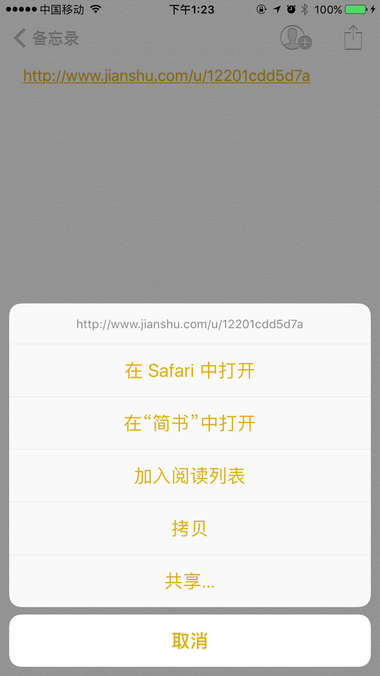 如果App支持了Universal Links方式,那么可以在其他App里面直接跳转到我们自己的App里面。如下图,点击链接,由于该链接会Matcher到我们设置的链接,所以菜单里面会显示用我们的App打开。