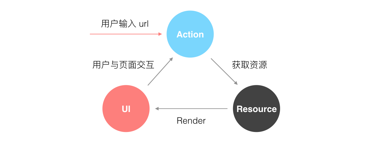 在SPA单页面应用,路由起到了很关键的作用。路由的作用主要是保证视图和 URL 的同步。在前端的眼里看来,视图是被看成是资源的一种表现。当用户在页面中进行操作时,应用会在若干个交互状态中切换,路由则可以记录下某些重要的状态,比如用户查看一个网站,用户是否登录、在访问网站的哪一个页面。而这些变化同样会被记录在浏览器的历史中,用户可以通过浏览器的前进、后退按钮切换状态。总的来说,用户可以通过手动输入或者与页面进行交互来改变 URL,然后通过同步或者异步的方式向服务端发送请求获取资源,成功后重新绘制 UI,原理如下图所示: