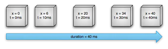 图1描述了使用其X轴属性的动画对象,表示在屏幕上水平位置的移动。动画的持续时间40ms,行进距离40像素,这样每10ms水平移动10像素。图示的是线性插值动画,速度保持恒定。