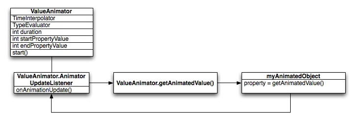 然而,第一段代码片段对对象没有实际影响,因为ValueAnimator不直接对对象或属性操作。 你想做的最可能的事情是修改要用这些计算值的对象。 你可以通过在ValueAnimator中定义监听器以在动画的生命周期内适当地处理重要事件(例如帧更新)来实现此目的。 当实现侦听器时,您可以通过调用getAnimatedValue()获取特定帧刷新的计算值。