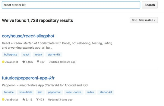 遗憾的是,大部分的官方 hello,world 都不是很详细,这时候我们可以在 GitHub 上搜索 xxx starter kit 来做同样的事,如 React Starter Kit,就可以轻松地在 GitHub 上找到相就的项目,如react-slingshot