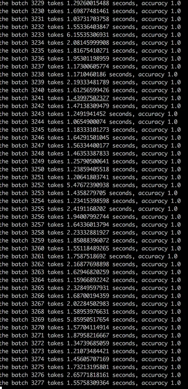 logger.info('the batch {0} takes {1} seconds, accuracy {2}'.format(i, time.time()-start_time, acc))