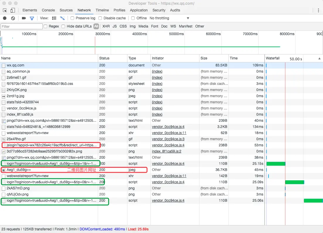 首先分析二维码图片地址:login.weixin.qq.com/qrcode/Aeg1… 刷新几次可以知道地址有两部分组成,login.weixin.qq.com/qrcode/ 和Aeg1_du59g==,第一部分是固定的url,后面的参数一个二维码对应一个参数,在该请求前面有一个login.wx.qq.com/jslogin?app…,返回结果为window.QRLogin.code = 200; window.QRLogin.uuid = “Aeg1_du59g==“; 其中uuid就是二维码地址的参数