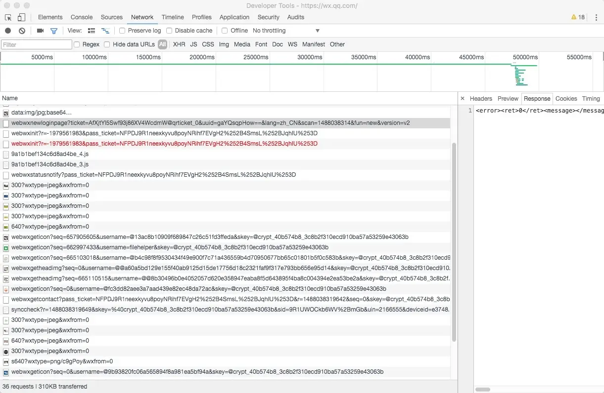 打开微信网页wx.qq.com/ ,有一个二维码用户通过app扫描二维码即可登录,需要先分析二维码生成方式。打开浏览器的开发者工具,打开后刷新微信登录页面,可以看到有以下一些请求