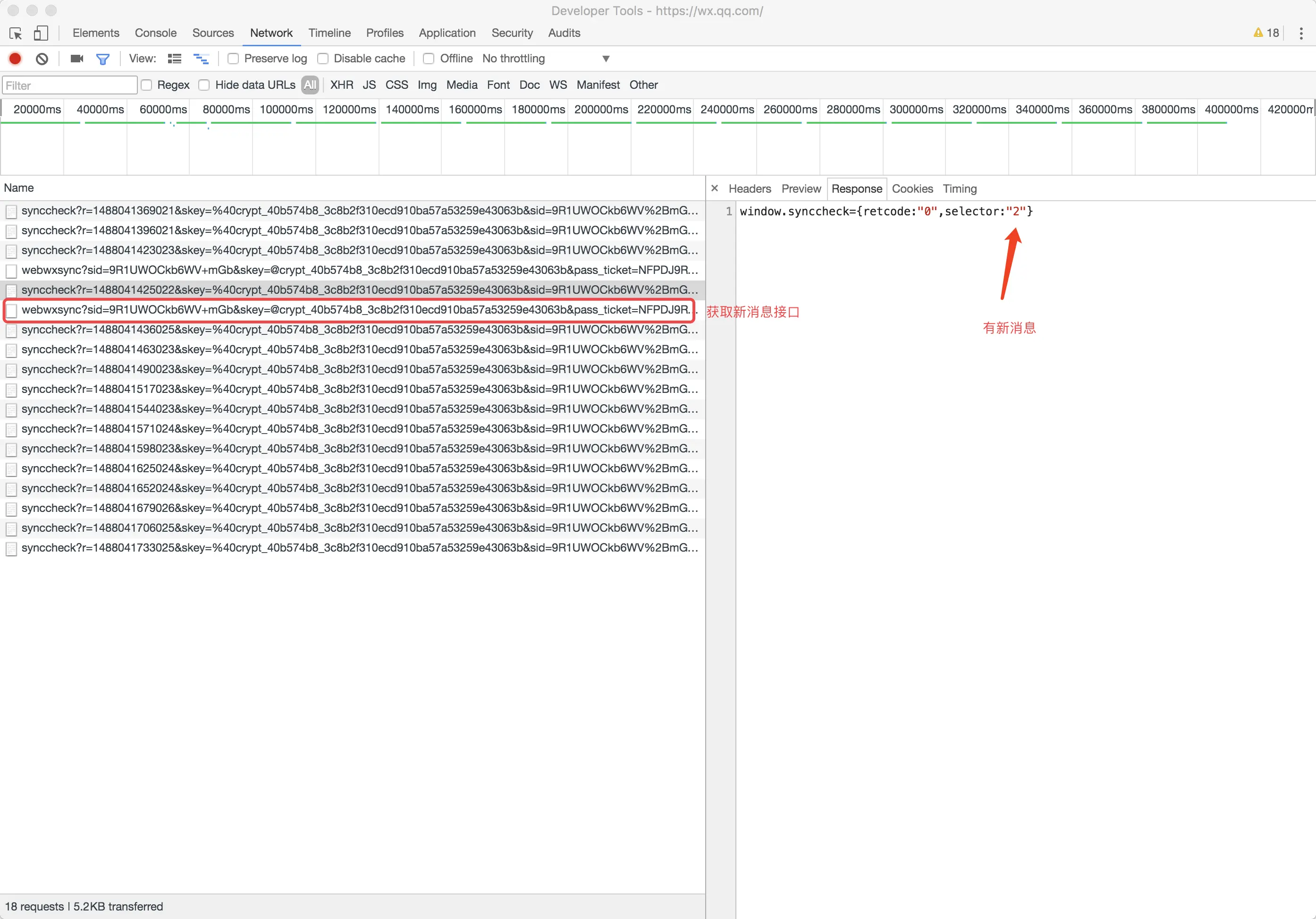 synckey为获取最近联系人返回的SyncKey拼接而成,selector=2时,说明有新消息到达。