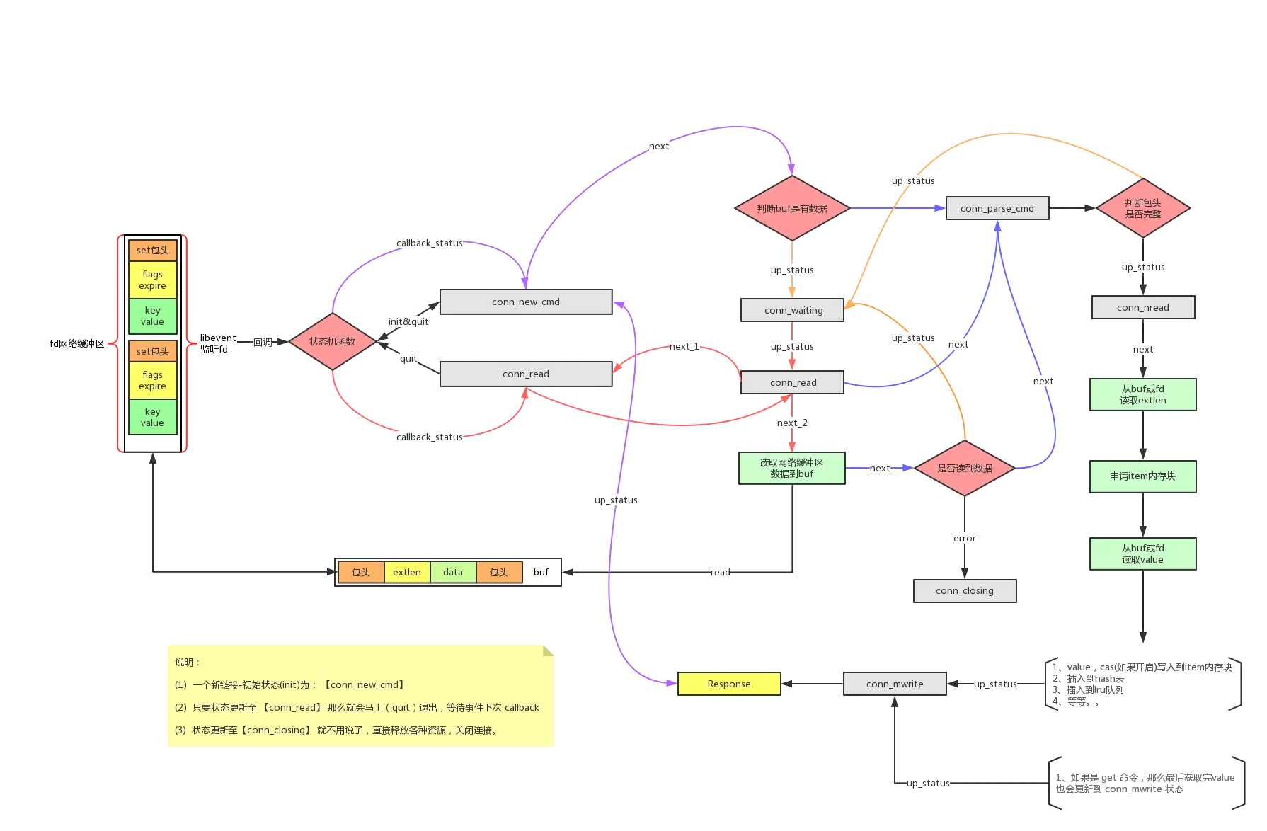 memcache 的 libevent 库使用的触发模式为 水平触发 (level-triggered,也被称为条件触发) 只要满足条件,就触发一个事件 , 就是只要有数据没有被获取, 内核就不断通知你, 所以说状态机函数里面有的状态处理完了,只是更新一下下次的处理状态, 就直接退出, 这并没有什么问题,因为只要网络缓冲区还有数据, 就会不断的触发事件回调函数,然后继续处理状态。
