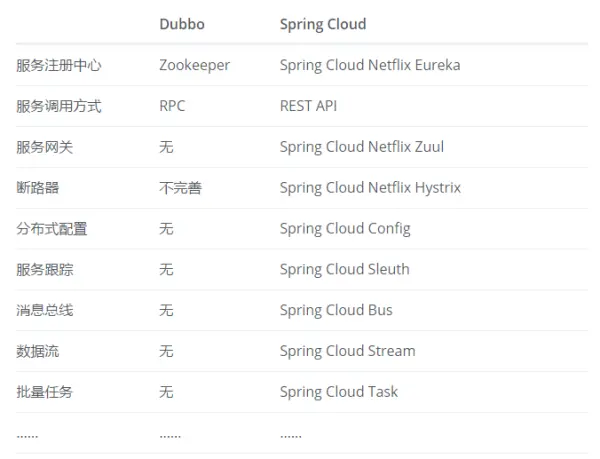 或许很多人会说Spring Cloud和Dubbo的对比有点不公平,Dubbo只是实现了服务治理,而Spring Cloud下面有17个子项目(可能还会新增)分别覆盖了微服务架构下的方方面面,服务治理只是其中的一个方面,一定程度来说,Dubbo只是Spring Cloud Netflix中的一个子集。但是在选择框架上,方案完整度恰恰是一个需要重点关注的内容。