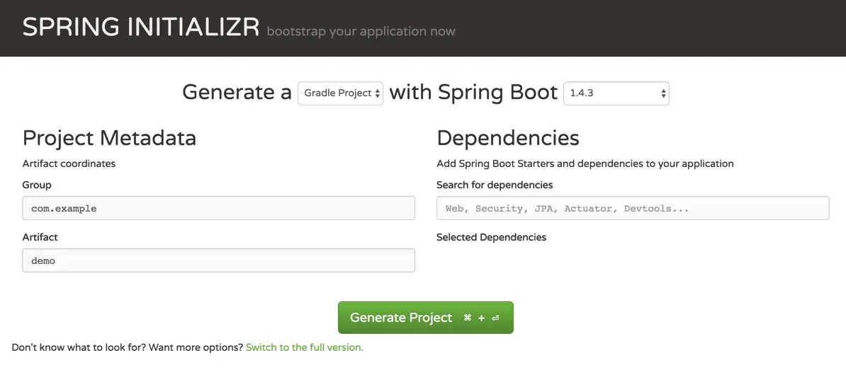 有很多种方法可以创建一个Spring Boot项目,其中最简单的一种是通过一个叫Spring Initializr的在线工具 http://start.spring.io/ 进行工程的生成。如下图所示,只需填写一些参数就可以生成一个工程包了。