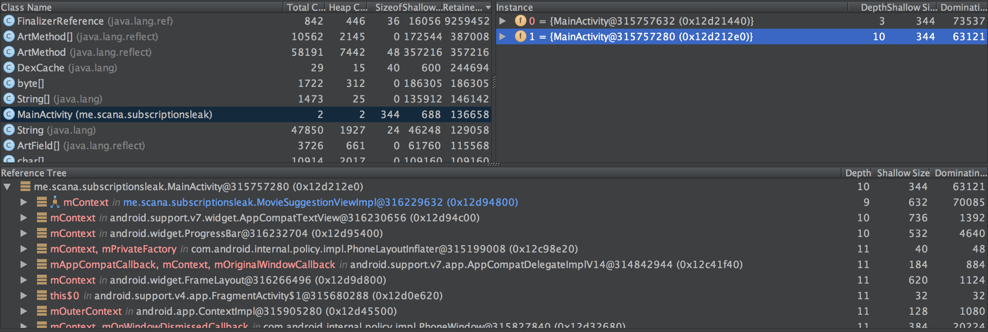 Subscription对象持有对你的回调的 final 引用。你的回调可能引用和 Android 生命周期绑定的对象。如果不小心的话,他们都有可能造成内存泄露。- 你可以使用 StrictMode, javap, HPROF Viewer 等工具寻找和分析泄露的根源。我在文章中没有提及,但你也可以尝试 Square 的 LeakCanary。