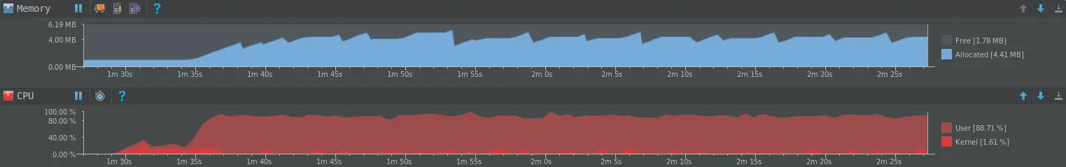 运行程序并监测后台,发现内存基本稳定在6M左右;测试5W多条的数据量总花费的时间为68s左右。监测图如下: