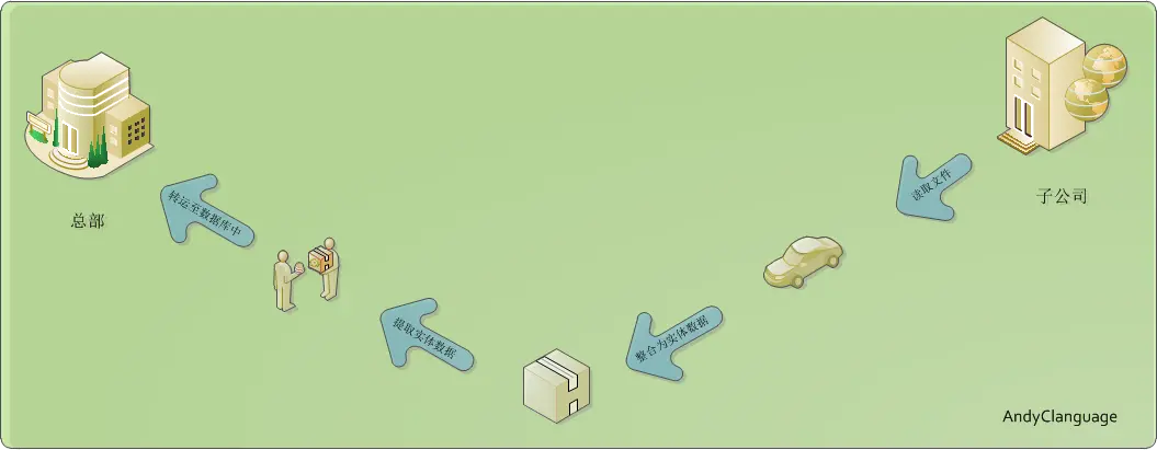 将子公司货物(单行数据)快速打包成货物(解析)并运送至交接位置处(内存),然后交由速度较慢的运送方式将货物运送至总部(数据库)。该方式为顺序流程,当货物运送至总部后才会再次从子公司重新开始运送货物。该方式有几个缺点: