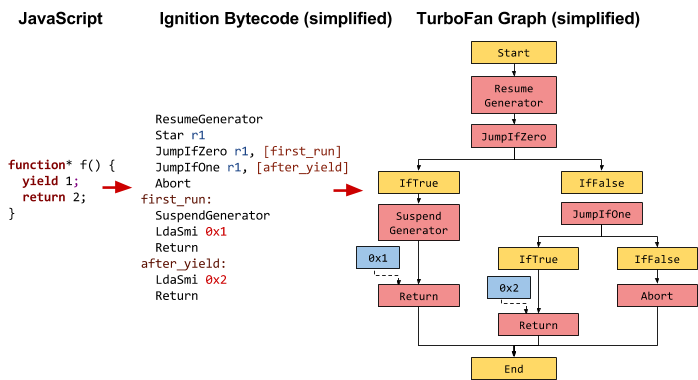 TurboFan 引擎不仅仅是增加了对 async 的支持,更增加了对 async、generators 优化的支持。下面是生成的二进制码和 TurboFan 执行图:
