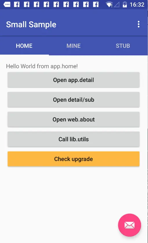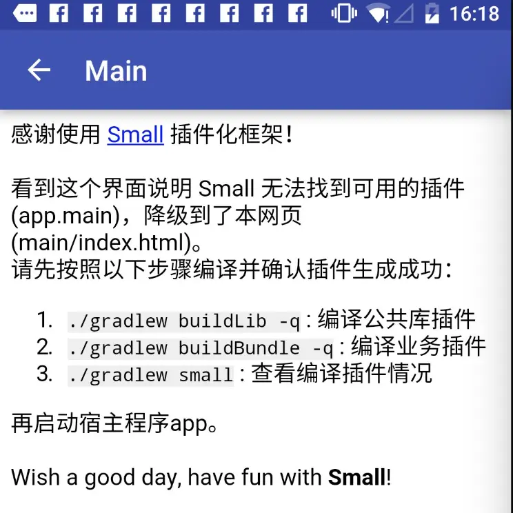 Small.setUp(this, new Small.OnCompleteListener() { @Override public void onComplete() { Small.openUri("main", MainActivity.this); } });main就是刚才bundle.json中uri的参数。说明我们要启动main这个module的MainActivity。