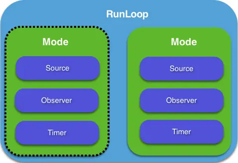 这个关系图其实就是说: 在一个RunLoop中可以存在两个或者两个以上的模式,但RunLoop每次只能选择一个模式运行, 就像空调有制冷和制热模式, 但是运行的时候只能选择制冷或者制热模式, 要保证运行循环RunLoop不退出, 每个模式里面至少存在一个Source或者 一个Timer,Observer可以有也可以没有, 只是监听RunLoop的运行状态.