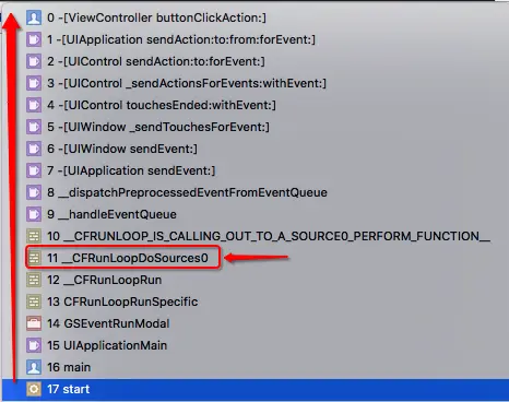 我们可以看出, 点击按钮时, 运行循环RunLoop处理的输入源是source0