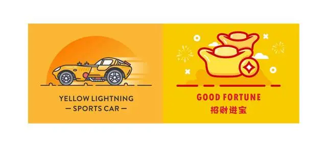 2:元宝图形的使用环境是在烟花点缀的簇拥之中如果使用过多的断线处理画面整体就会感觉被散开,设计师使用了红色中偏黄并降低饱和度的颜色很好的消除原本使用黑色线条的压抑感,并且这种偏暖的红色会更加增加元宝金光闪耀的色泽。