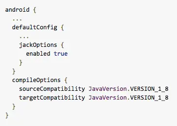 要为你的项目启用 Java 8 语言功能和 Jack,请在模块级别的 build.gradle 文件中输入以下内容: