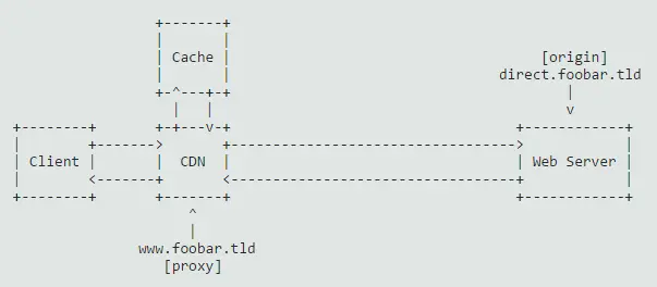 我们来做个例子,假设你有一个可访问的网站,URL 是 www.foobar.tld。在这样的场景下,域名 www.foobar.tld 会被放到 pull CDN 服务器中,而不是你的网站服务器中。CDN 作为你网站服务器的一个代理。