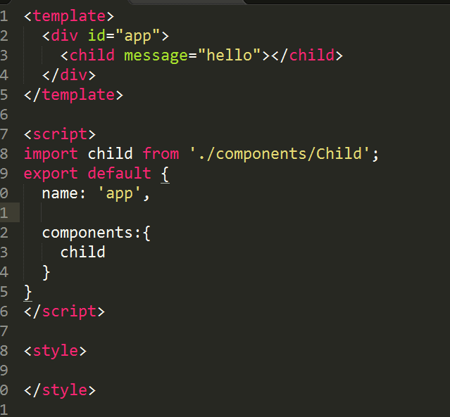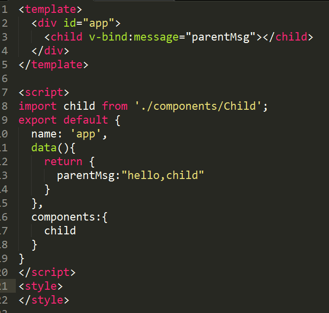 3.在App.vue中注册Child组件,并在template中加入child标签,标签中添加message属性并赋值