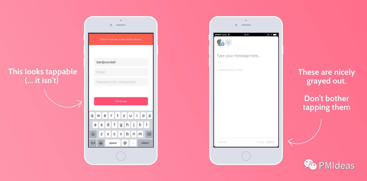 有了触摸屏/鼠标,理论上,用户可以触摸/点击到界面中的任何地方。然而在游戏Breath of Fire中,即使可选项有限,设计糟糕的按钮依然可能将用户带入错误。Peach中迷人的按钮看起来是可以点按的,但实际上向你传达了错误信息(实际不可点),Buffer 则将不能交互的按钮置于灰色从而达到理想的设计平衡(直观易于理解)。