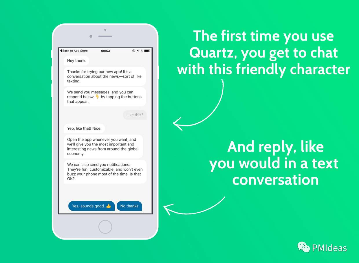 上述这种方法对App同样有效。新手引导的作用之一就是减少用户的初始压力,Quartz 使用一个很好的方法,它将产品置于一个用户普遍熟悉的文本对话式环境中——使用一个健谈的AI(跟用户对话将其带入预先布置好的场景)。