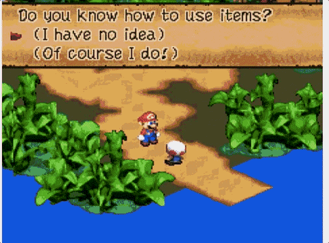 它甚至出现了一些新手引导,而不像 Breath of Fire 中的菜单那样,甚至在用户还没有看到游戏界面是什么样子之前就逼迫用户做出选择。