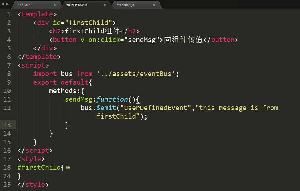 二 . 创建一个firstChild组件,引入eventBus这个事件总线,接着添加一个按钮并绑定一个点击事件