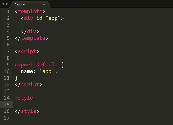 我们在git上运行 npm run dev 的命令后,浏览器中会打开一个vue基于webpack构建工具的一个模板项目,接着我们在编辑器中进入Demo,我们可以删除掉模板项目中src/components/Hello.vue,然后在App.vue中删除对于Hello子组件的注册和使用还有一些其他无关紧要的东西,此时的App.vue应为这样