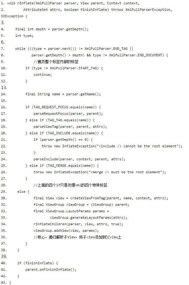 看完源码,发现基本思路差不多。只是“子View递归”似乎不太一样,是的,这里子View的“打气”交给了rInflateChildren完成,而rInflateChildren指向的是rInflate方法。