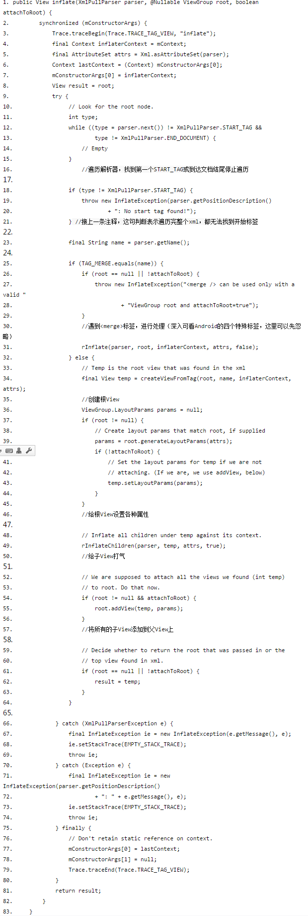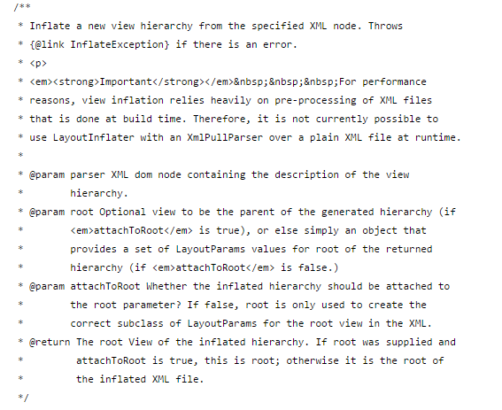拆开这个打气筒,我们发现:不管你是使用的哪个inflate()方法的重载,最终都会辗转调用到LayoutInflater的如下代码中(部分调试输出被删除):