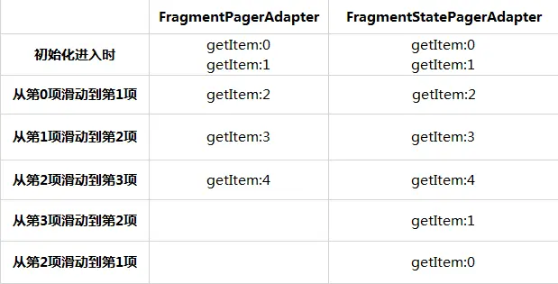 但是仔细对比了一下三个Adapter创建视图的过程,发现自己错了,因为在使用Fragment作为子视图时,我们是通过getItem方法返回Fragment的,单纯从这里打印instantiateItem的调用不代表Fragment真的完全被重新创建了(重新创建代表需要重新add,即从头走一遍生命周期,但是在这里不能证明),也可以通过两个FragmentAdapter中instantiateItem的实现证明(观察getItem方法的调用条件),所以又在Fragment对应的两种Adapter的getItem中添加相应的log代码,如下: