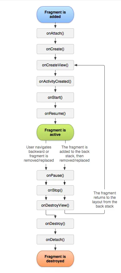 比起detach,remove的做法很直接,它直接对应执行了Fragment生命周期中onPause()-onDetach()的方法,所以在恢复(这里需要重新add了)时,需要执行的是add方法(可以在FragmentPagerStateAdapter的instantiateItem方法中看到调用,对应源码下面给出),add方法对应执行了Fragment生命周期中onAttach()-onResume()的方法。