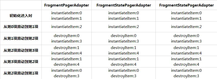 从图中我们可以看到,三种Adapter在相同的情况下,ViewPager的子页面销毁和创建时机是一样。但是这好像违背了我们之前学过的,因为我们通常所听到的都是FragmentPagerAdapter会缓存所有的Fragment子项,而上图中我们看到的是在滑动的过程中它的destroyItem方法被调用了,而在滑动回来时相对应的子项Fragment也确实调用instantiateItem方法。根本就没有缓存?!