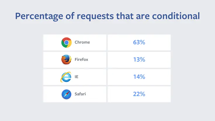 2014 年,我们发现 60% 的静态资源请求会得到 304 响应。由于内容定址 URL 永远不会改变,这意味着有机会优化掉 60% 的静态资源请求。 在 Scuba 的帮助下 ,我们开始研究条件请求的数据。我们注意到,不同浏览器的表现之间存在巨大差异。
