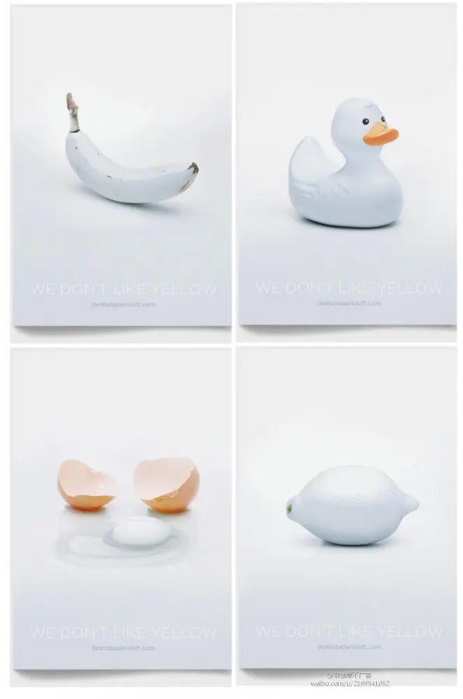 这一系列来自法国牙医中心Centre Dentaire Paris Loft的广告使用颜色作为主题,将一般为黄色的物体描绘成珍珠白,并在底部加上“我们不喜欢黄色”的口号。 这种使用“不正确”的颜色使用造成一种冲突感,捕获了大量的注意,同时做一个非常强烈的声明。