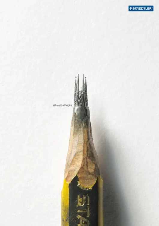 看看Staedtler文具公司的这则广告。 其中显著体现了比例缩放的原则——首先,铅笔已经放大了很多,但重点仍然在被雕刻成精美大教堂的笔尖上。使用大幅度的比例缩放不仅能够吸引观众看得更仔细,而且还强化了“大始于小”的概念。