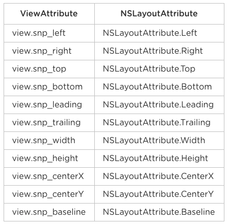 SnapKit支持的属性与 NSLayoutAttrubute 对照表如下: