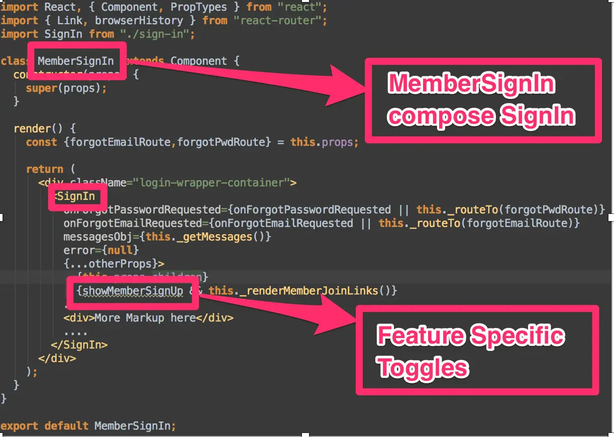 在租户之间还有更大的差异,例如对于可分享组件中的 DOM 的变动我们会采取两个策略。对于微小的 DOM 变动, 我们通过组件的属性决定是否启用和操作它的子组件。我们的登录表单就是这样做的,Sam’s Club 希望在密码表单中有一个 "显示密码" 的按钮而 Walmart 则不需要。我将会使用一个叫做 “displayShowPassword” 的属性来管理这个租户的特定需求。